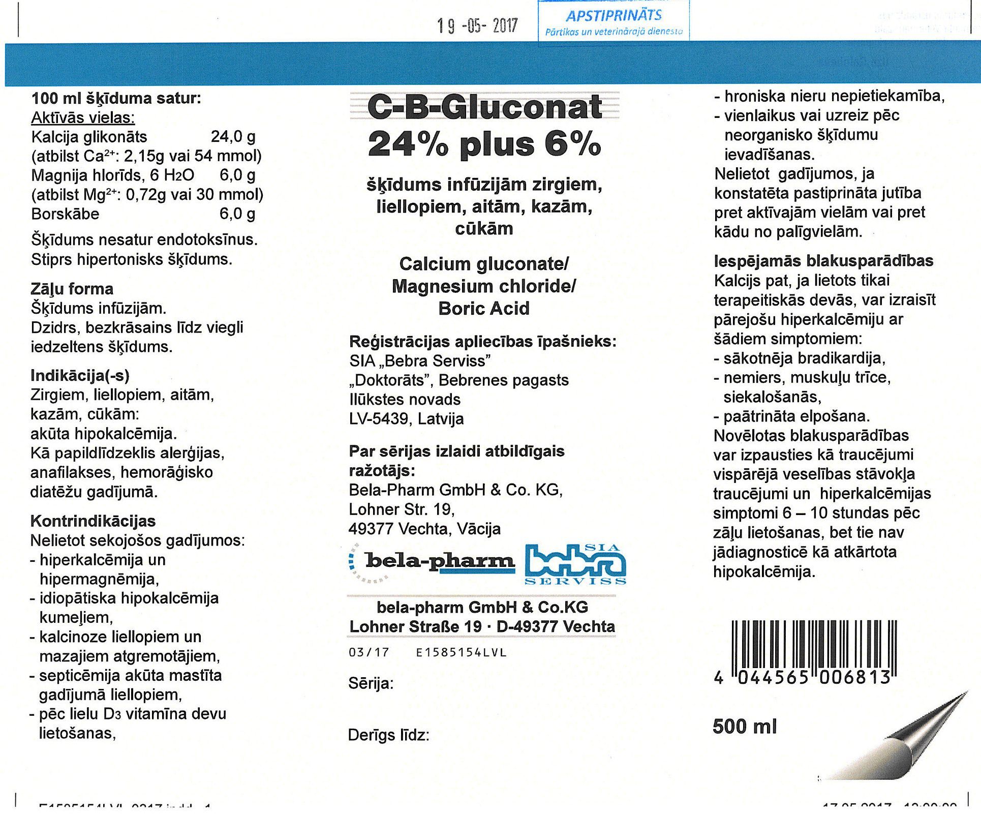 | C-B-Gluconat 24% plus 6% | - | V/NRP/14/0004 | Bela-pharm GmbH&Co.KG, Vācija | QA12AX | cattle; pigs; sheep; goats; horses | Vairāk | ||||||||||||||||||||||||||||||||||||||||