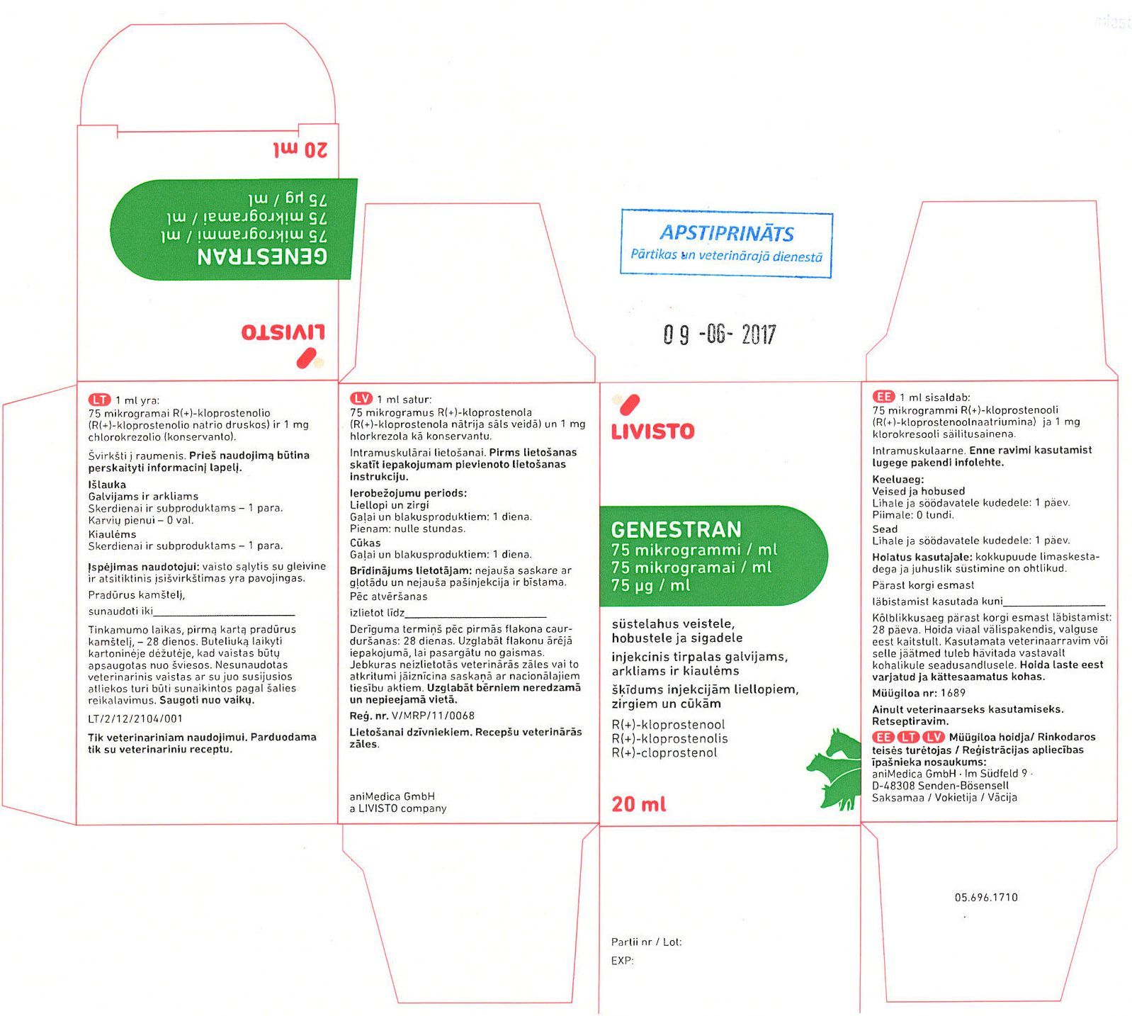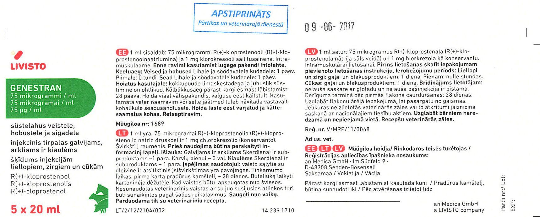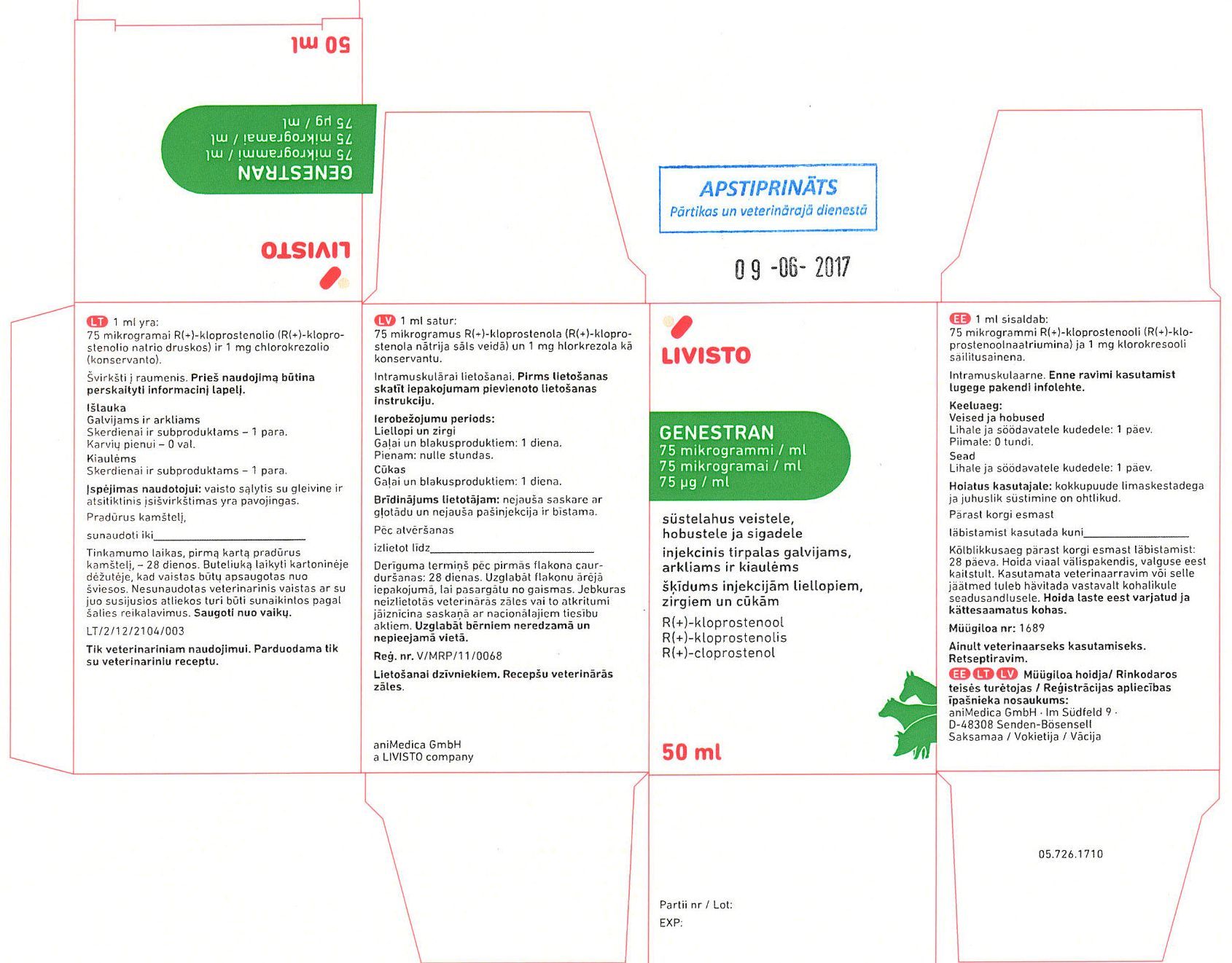 | Genestran | 75 µg/ml | V/MRP/11/0068 | aniMedica GmbH, Vācija | QG02AD90 | cattle; pigs; horses | Vairāk | ||||||||||||||||||||||||||||||||||||||||
